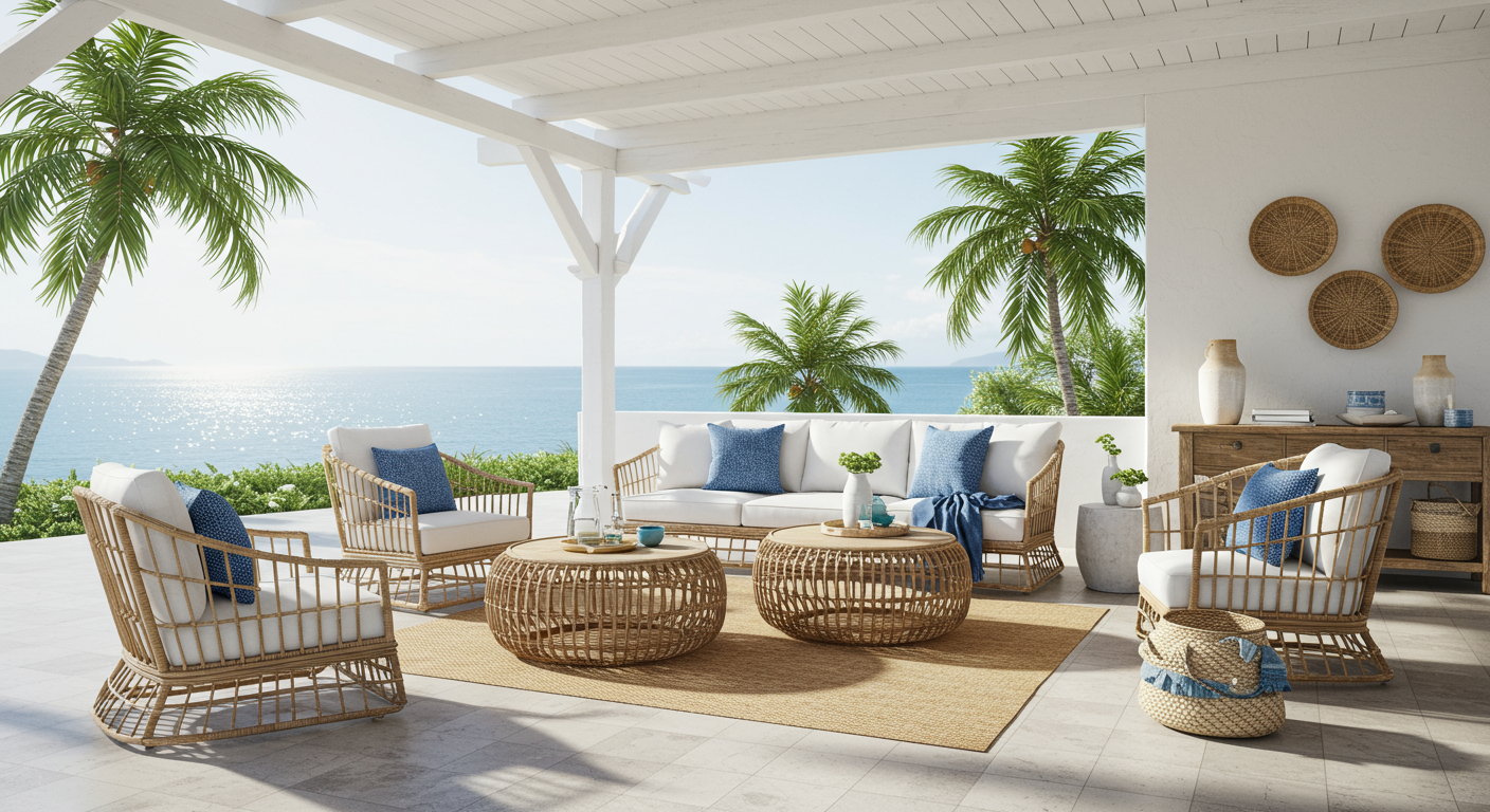 Not to be confused with coastal interior design, a beach style is more tropical. Beach interiors often make use of oak tones, relaxed linen textiles, and Aegean blue accents.